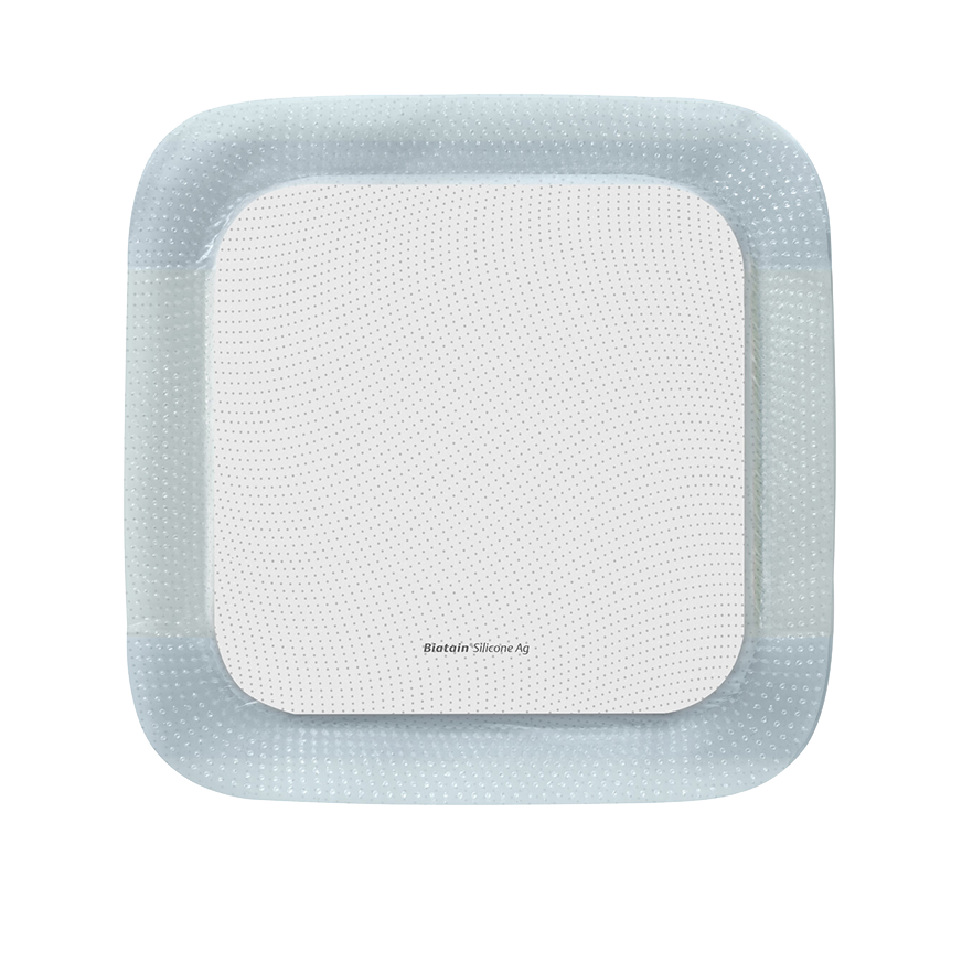 The silicone adhesive layer provides a secure fit to keep the dressing in place while ensuring minimal pain upon removal. The soft and flexible design of Biatain® Silicone Ag ensures a close fit to wound and body and the foam pad at skin level makes Biatain® Silicone Ag suitable to wear under compression.
